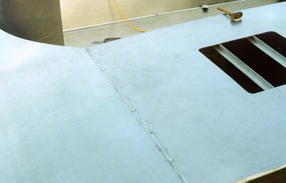 August 23 1998 11 hour: Cut bridge aft section. Chunkout cabintop centre and aft cockpit bulkhead. Weld out lap joint on top at cockpit bulkhead. Tack front end and support with 2 /12" Tbar. Cut and start to fit first 9" half pipe stringer under bridge. Weld out most of mid deck and stitch forward side decks to Tbar. Had my wife help out for 1.5 hr !!!