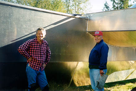 Sept 27 1998 18.5 hour: More weldout of stb hull interior. Dad up to help hold skin against stringers to tack out stringers.