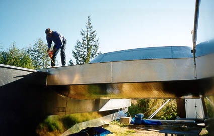 Oct 17 1998 5 hour: Fab and stitch in a couple of cabin top frames. Finish tacks on under deck beams. Cut 10' chunk off of 9" pipe for more bridge deck beams.