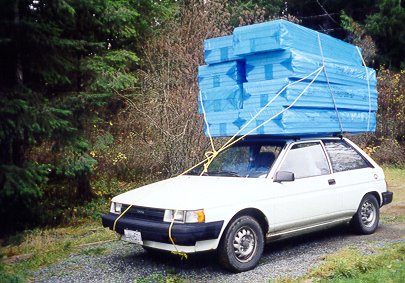 9 hour: Finished boom goosneck toggle and monuted boom. Cut bunch of SM foam for cabin top. Decided to use board foam rather than spayed urethane. I requested 3 quotes and they were all around Can$ 4000 to $4500. One was a sorta over the phone, one was a fax and one guy showed up to see the job. Except for the liquor on his breath at 5PM he seem pretty on the ball with material specs and tips for prep. When I called him up in October he did not seem too comfortable with doing it in the weather conditions ( too cool ). He would need tarps heaters and 3 days of my time plus a suitable weather window. The cost would go up too as the foam expansion would not be as good. I asked him if he was sure he would be able to get it done in November and he could not make a firm commitment. Sooo with no fixed price and no assurance the job would be done I decided to go with board foam. This works pretty well in a sheet boat. Still it has to be bonded and then all the joints sealed to form a vapour barier to prevent condensation on the skin. Took 4 trips with the beater to get it all home. Foam cost this way is about Can$1300 plus a bunch of polyurethane gunk Sonolastic 150 at about $600 and about $400 of canned foam to cover over the edges beside the furring strips and in other areas. So its about 1/2 the cost and perhaps 2/3 the weight which are nice bonuses. Still takes a bunch of time though.
