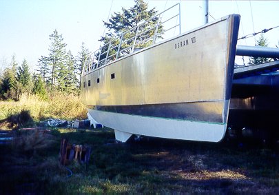 8 hour: Ground last of port hull and got first epoxy coat on. It was very wet and muddy and had the ground fault circut trip a couple of times. Paint schemes is 80grit sand, 2 part acid wash primer, 2 coats Ameron barier coat epoxy ( 12 mil dry ) 2 coats EP21 zinc based antifouling. All the primer and barier cost about Can$400 and the 4 gals of antifouling cost Can$850. Did initial fitup on arch/davit.