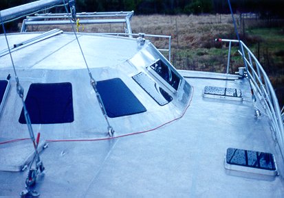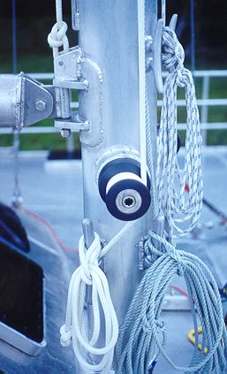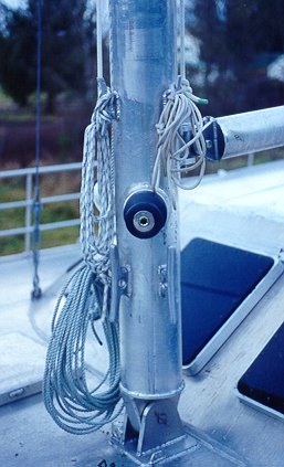 6.5 hour: Clean aluminium bits off deck and reave main halyard and put swivel on masthead spinaker halyard. Gerard gave me a quick trip to the masthead. Can actually see the ocean from up there. Kind of an unusual sensation with your life hanging from a weld ( that you did yourself ). Finished tack end of jib boom and mounted boom. Sewed a couple more foredeck webbings in place. ( that will be fun to do in January and February).