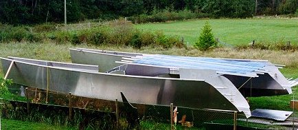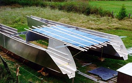 Sept 1 10 hour: Finish Tbar on stb inner panel. Cut groove for deck in toerail, also now beveling groove with grinder. Built lattice blocks and blocked hulls up 6" and level on WL for and aft. Pulled inner topside into place and tacked about 10'. Got two hulls now, still a bit of work to do finishing the tack up.