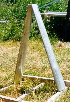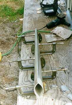 June 20 1998 9 hour: Cut and fit bow tube. This was a design change from the original 6" OD 1/8" wall tube that was purchased for it. I have substituted a piece of the leftover 9" OD 3/16" wall purchased for the mast. This is way over spec for sailing loads but will provide a little reserve if I run something up between the hulls. It also simplifies the attachment of the seagull striker and bridle chainplates and provides a better support for the forward mooring posts.
