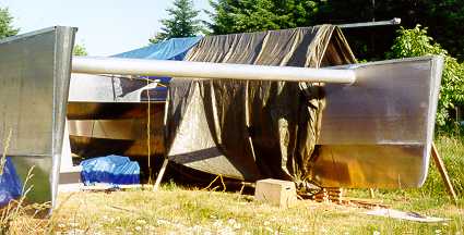 June 14 1998 2 hour: Move plate for frame 2 to work area. Wind storm has broken tacks on part of support for tarps. Remove forward tbar and now tarp lays on deck beams.