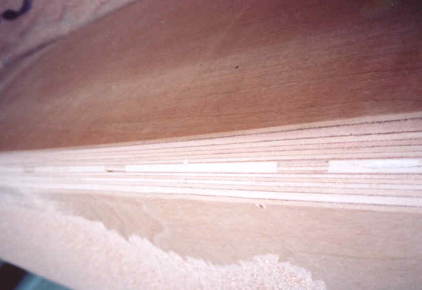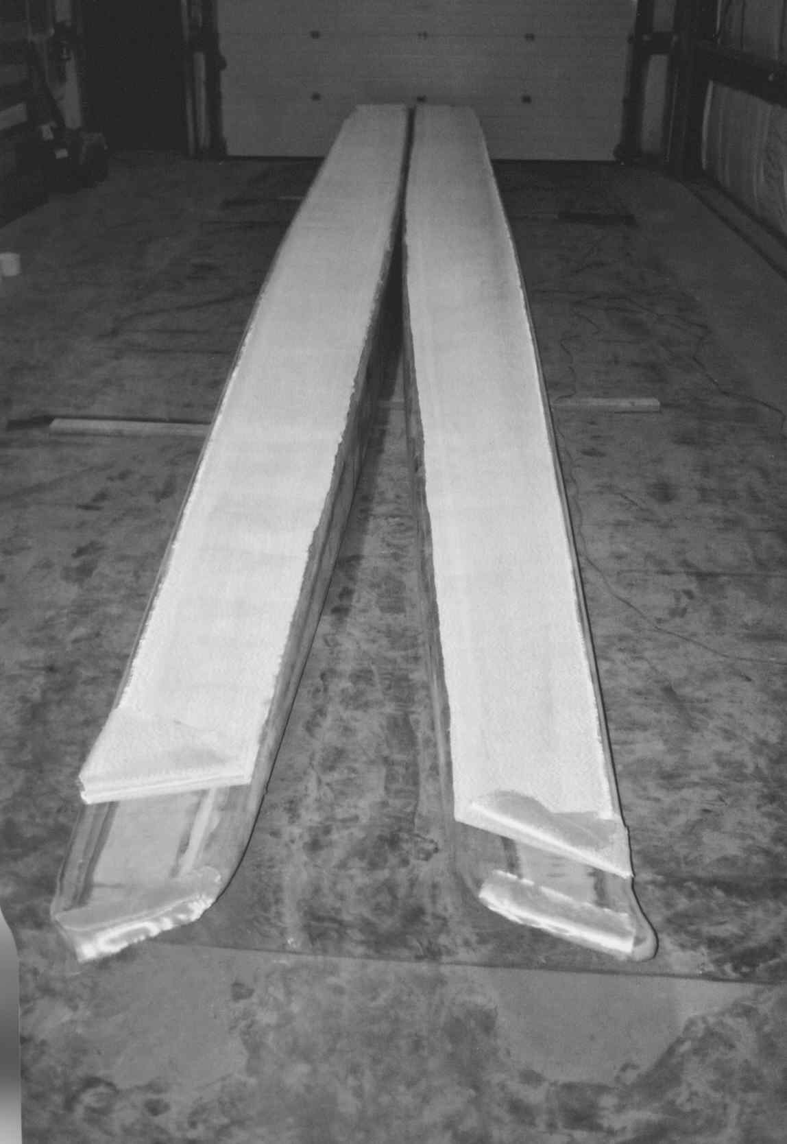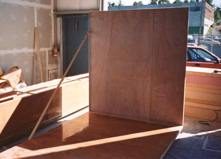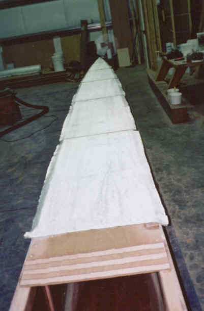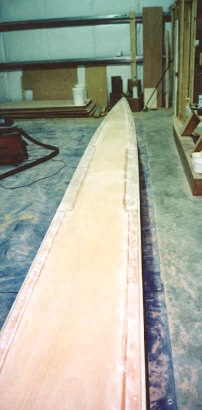 Aft cabin wall held in place for glassing bottom joint.