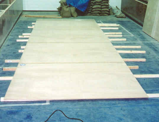 Two dimensional full scale mockup of interior layout. Hulls are about at final spacing.