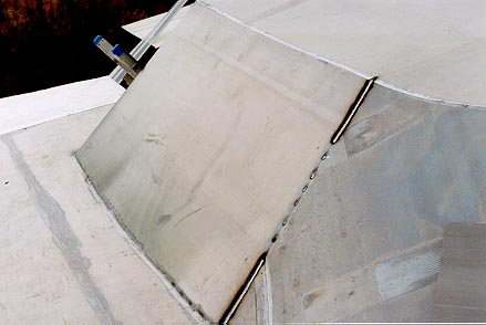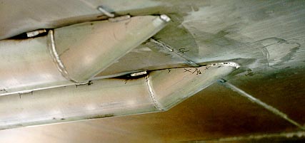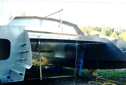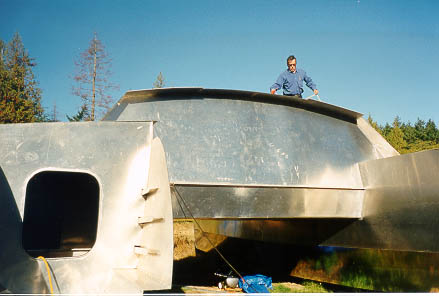 Sept 27 1998 18.5 hour: More weldout of stb hull interior. Dad up to help hold skin against stringers to tack out stringers.