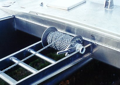August 31 1999 5 hour: Aft stb deck framing. Splice 20 fathoms 5/8" 3 strand nylon to 60 fathom 5/16" HT chain and rolled it onto the windlass drum. Made chain guard where the chain drags over the main beam.