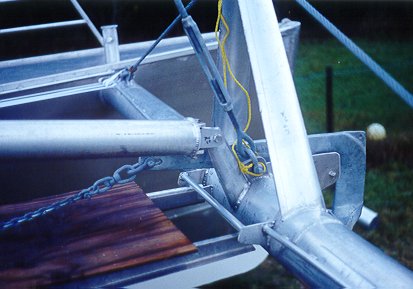 7 hour: Finished jib boom and hosit jib and measure for sail cover. The main and jib were built to the plans and the mast and rig was built concurently/after. The jib fits nicely and looks pretty good too ( Nice work Gary ).