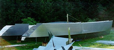 Sept 7 9 hour: Finish tackup of aft end of stb hull topsides, start joing offcuts to form plate for frame 1s.