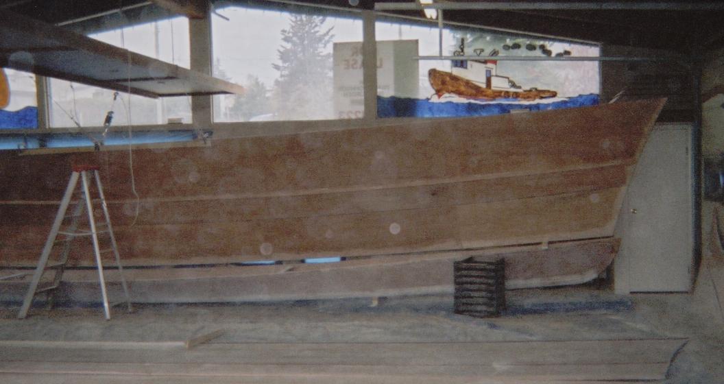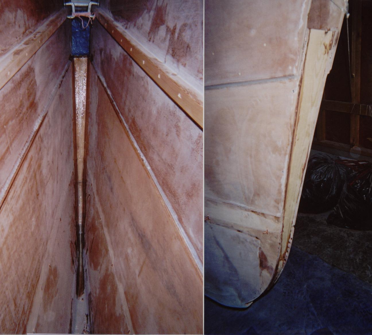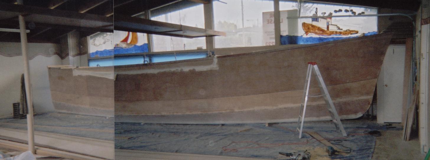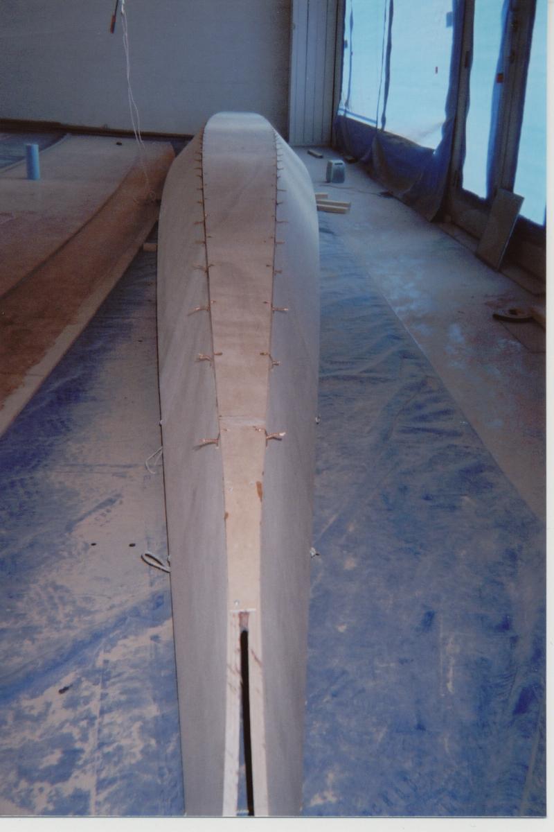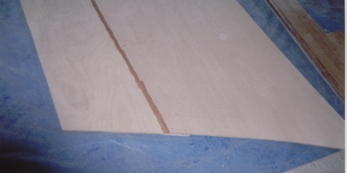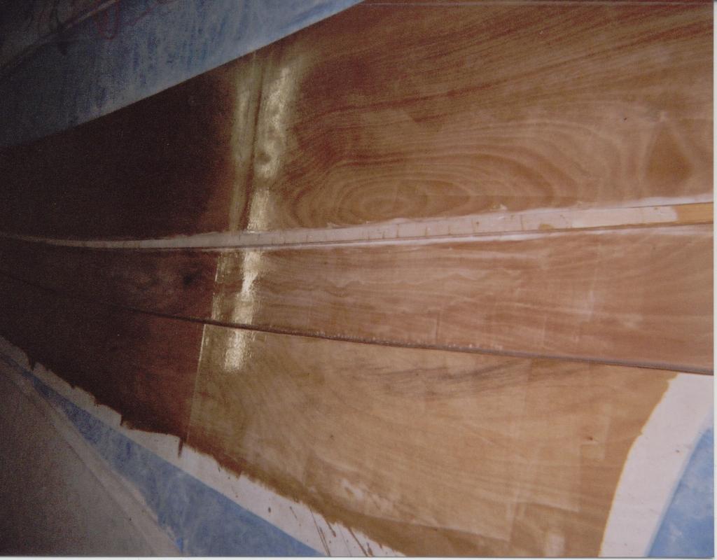 Bottom and double chine section. Bottom is 3/4" occume ply and chine panels are 5/8". Interior joint has been doen and exterior joint prep needed.