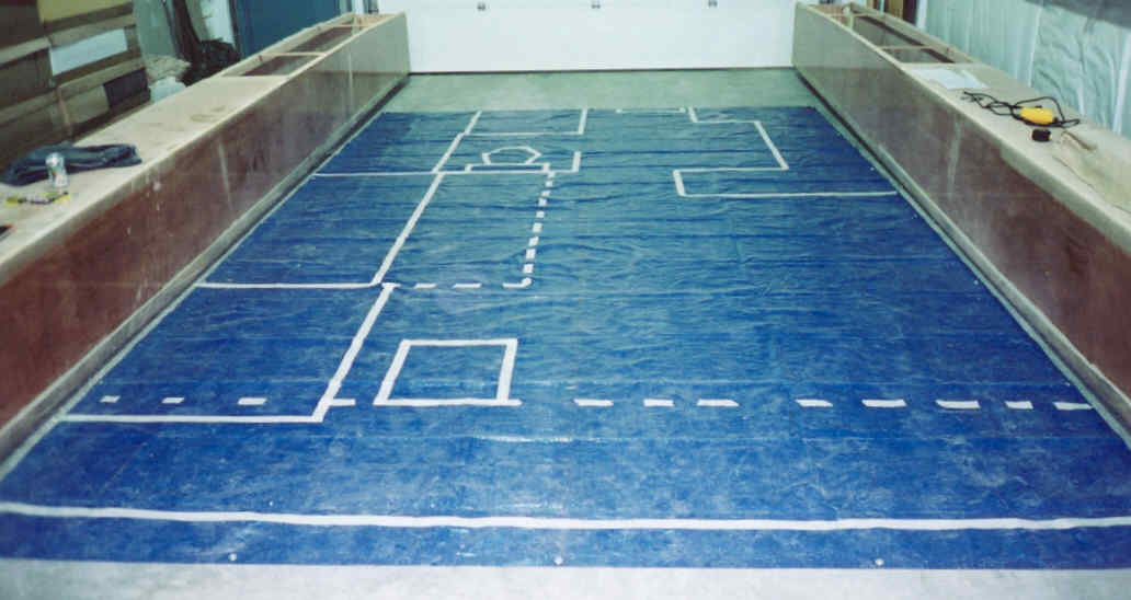 Two dimensional full scale mockup of interior layout. Hulls are about at final spacing.