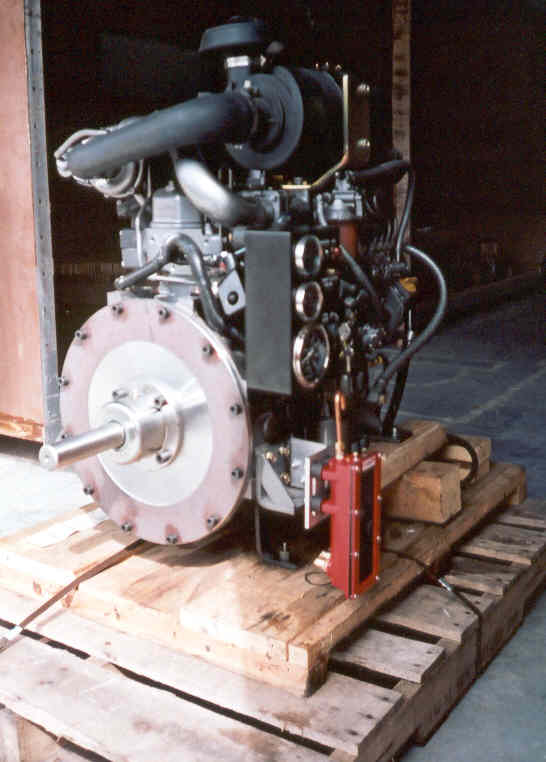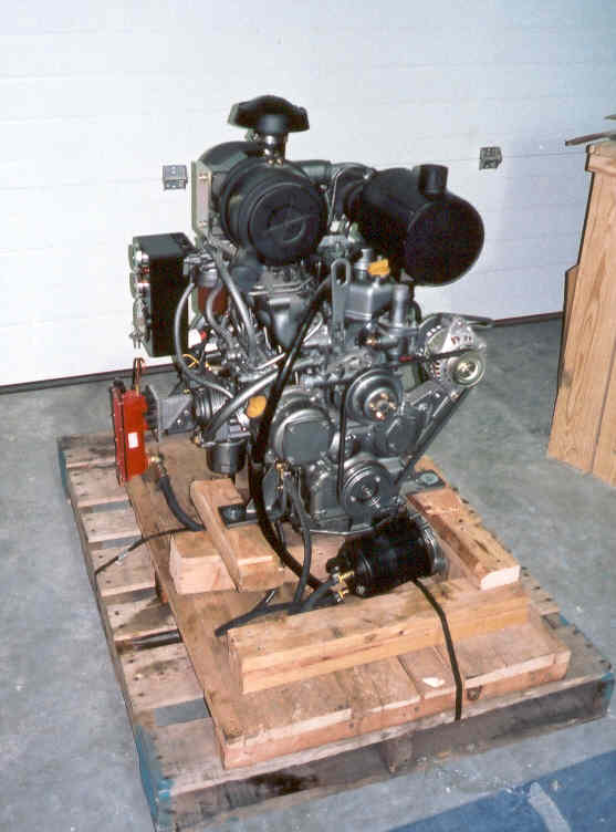 The engine arrives. Yanmar 4TNE84T SA 50HP all day at 3000RPM but will spend most of its time at 1400-1800. Red box on the left is a Murphy oil level gage and the round black can in the lower foreground is a Gulf Coast heavy duty oil filter.