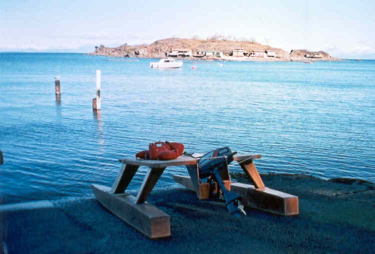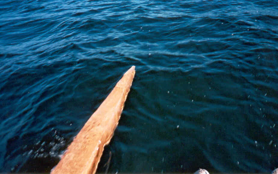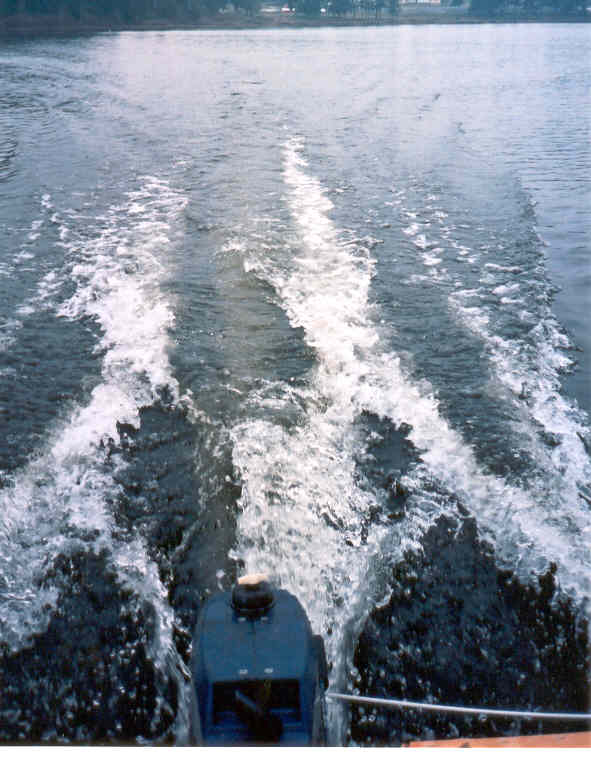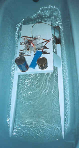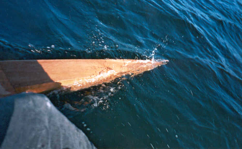 Ready for sea trials. Out past the island conditions were a chop of 1' to 2' on a swell of 2' to 3' . These would be comparble to typical moderate ocean conditions full scale equal to a wave chop of 3 - 5' on a swell of 5 to 8'. There was an area with wind against current that provided close breaking waves to test in.