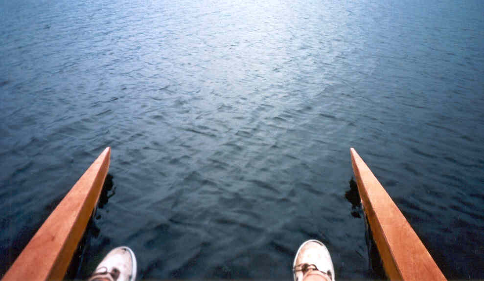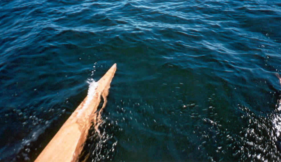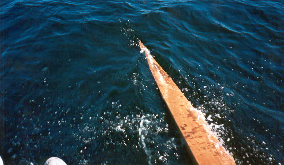 Downhill in these conditions the boat often surfed to 8.5 to 10 Kn. In the short chop there was a fair amount of yaw for a catamaran. This was likely due to the good match of wave length to boat length. In smaller waves or larger swells tracking was very good. The yaw refered to was not a problem to control despite the very primitive steering arrangment ( rope pulls that sort of worked. ). Skegs would help if needed.
